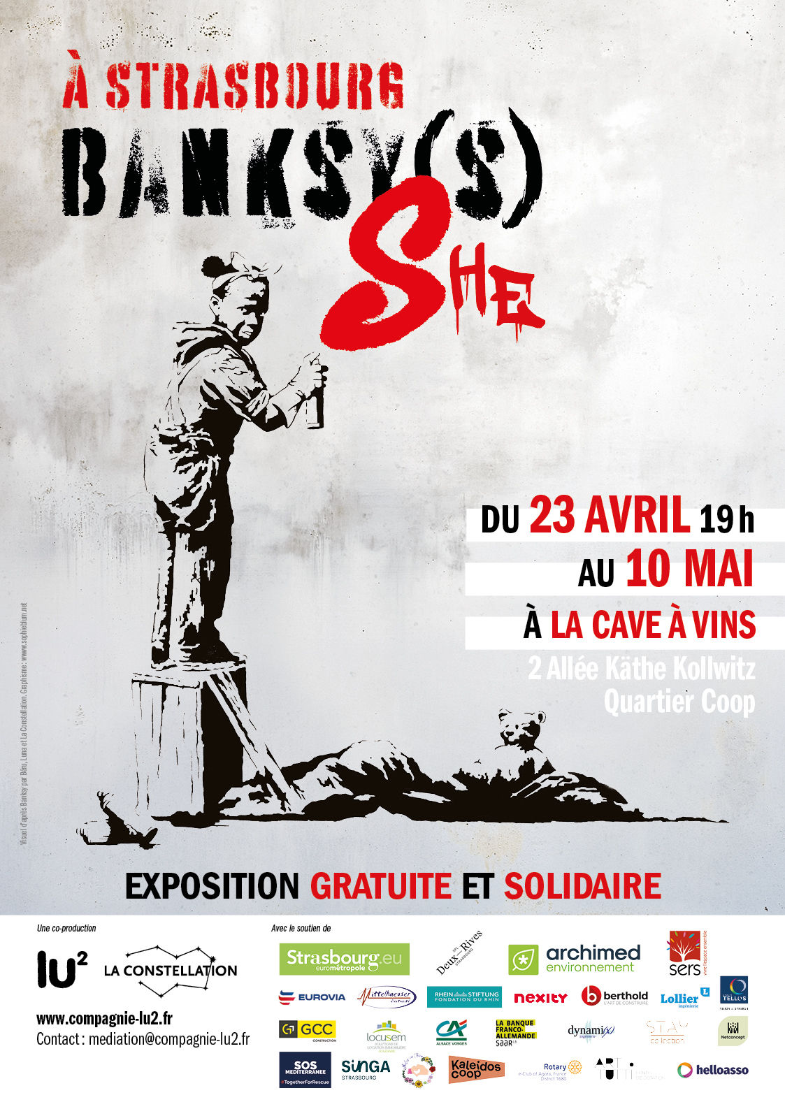 Du 23 avril au 10 mai 2026, l’exposition Banksy (s) s’installe à la Cave à Vins, au cœur du quartier Coop à Strasbourg. Lancé en synergie avec le festival Kaleidoscoopie, lu² et la Constellation se saisissent de ce format pour créer un événement attractif et inclusif à destination du grand public !