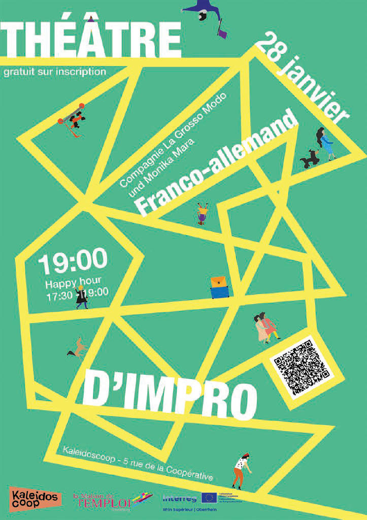 Rendez-vous mardi 28 janvier à partir de 17h30 (apéro) et à 19h pour le spectacle d’impro franco-allemand de la Compagnie Grosso Modo et Monica Mara du Stands Theater Freiburg !