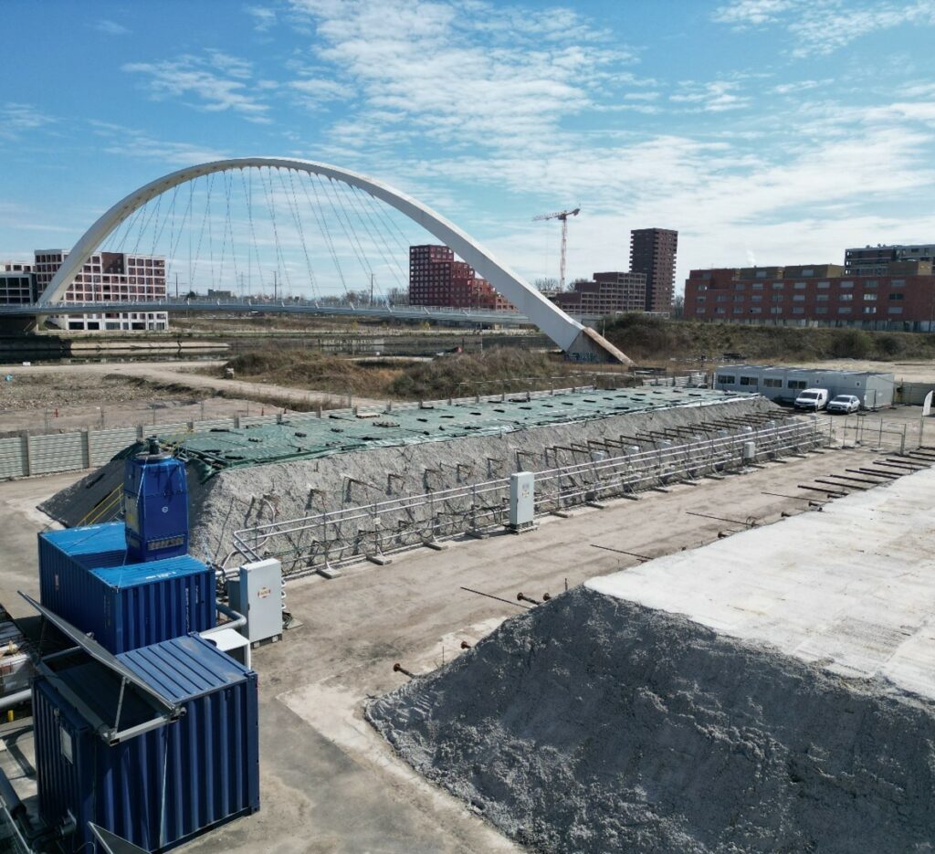 Deux réseaux dissociés de tubes sont positionnés dans la pile à l’avancement de la mise en tas des matériaux. À l’entrée du premier réseau de tubes, des brûleurs alimentés au gaz de ville ou des réchauffeurs électriques assurent la circulation d’air chauffé permettant la montée en température des terres. L’utilisation de réchauffeurs électriques en complément de bruleurs gaz, apporte de nombreux avantages, tel qu’un meilleur rendement énergétique et donc une optimisation financière substantielle, une réduction significative des émissions sonores et une amélioration du bilan carbone. Le second réseau de tubes est perforé afin de permettre, par une mise en dépression de la pile, la captation des polluants volatilisés dans le cœur de la pile. L’air chargé en polluant est ensuite canalisé vers des unités de filtration avant rejet à l’atmosphère. L’innocuité (c’est-à-dire la nuisibilité) des éléments relâchés dans l’air – de la vapeur d’eau et du CO2 issus de la désorption – est contrôlée à chaque instant pour garantir le respect des normes de rejet.