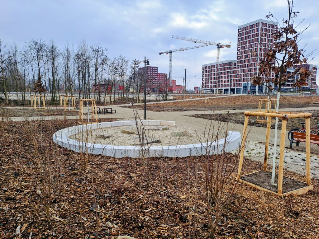 Un nouveau parc urbain vient révéler le paysage. Aménagé sur les terres fertiles de l’ancien Petit Rhin, il redessine le bras du fleuve et irrigue le quartier du Sud au Nord. Ses 5.6 hectares en font un vaste espace récréatif et sportif. Il est rafraîchi et s’agrémente d’une grande noue de collecte des eaux pluviales, à l’image des rieds alsaciens, humides et arborés. Cet espace de nature rétablit une continuité écologique entre les forêts du Neuhof, au sud, et de la Robertsau, au nord.